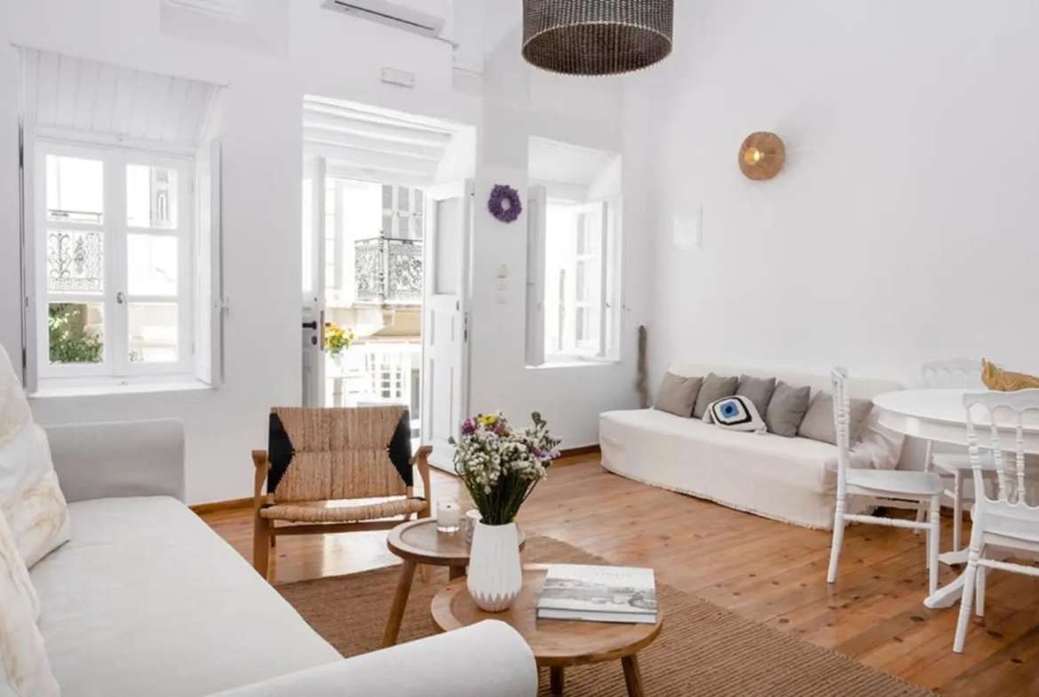 Step into a bright and open living room with high ceilings, a classic feature of Mykonian architecture. The large sofa bed easily converts into a full double bed (160x200 cm), offering a real bed experience. A second sofa bed converts into a single bed (100X180), making it comfortable for up to 3 guests to sleep in this space without feeling cramped.